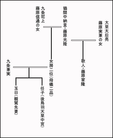 すなわち歌人藤原家隆の異母姉妹が「女房二位」であり、「女房二位」と九条兼実の間に生まれたのが任子と玉日であった。つまり任子と玉日は家隆の姪である。したがって藤原家隆と後鳥羽上皇とは九条兼実の二人の娘(任子と玉日)を介して姻戚関係にあった。